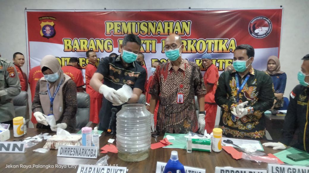 “Barbuk narkotika ini dimusnahkan dengan cara dilarutkan ke dalam air panas yang telah dicampur dengan cairan prostex. Setelah itu dibuang ke safety tank,” kata Kapolda Kalteng Irjen Pol Drs Djoko Poerwanto melalui Direktur Ditresnarkoba Kombes Pol Dodo Hendro Kusuma.
