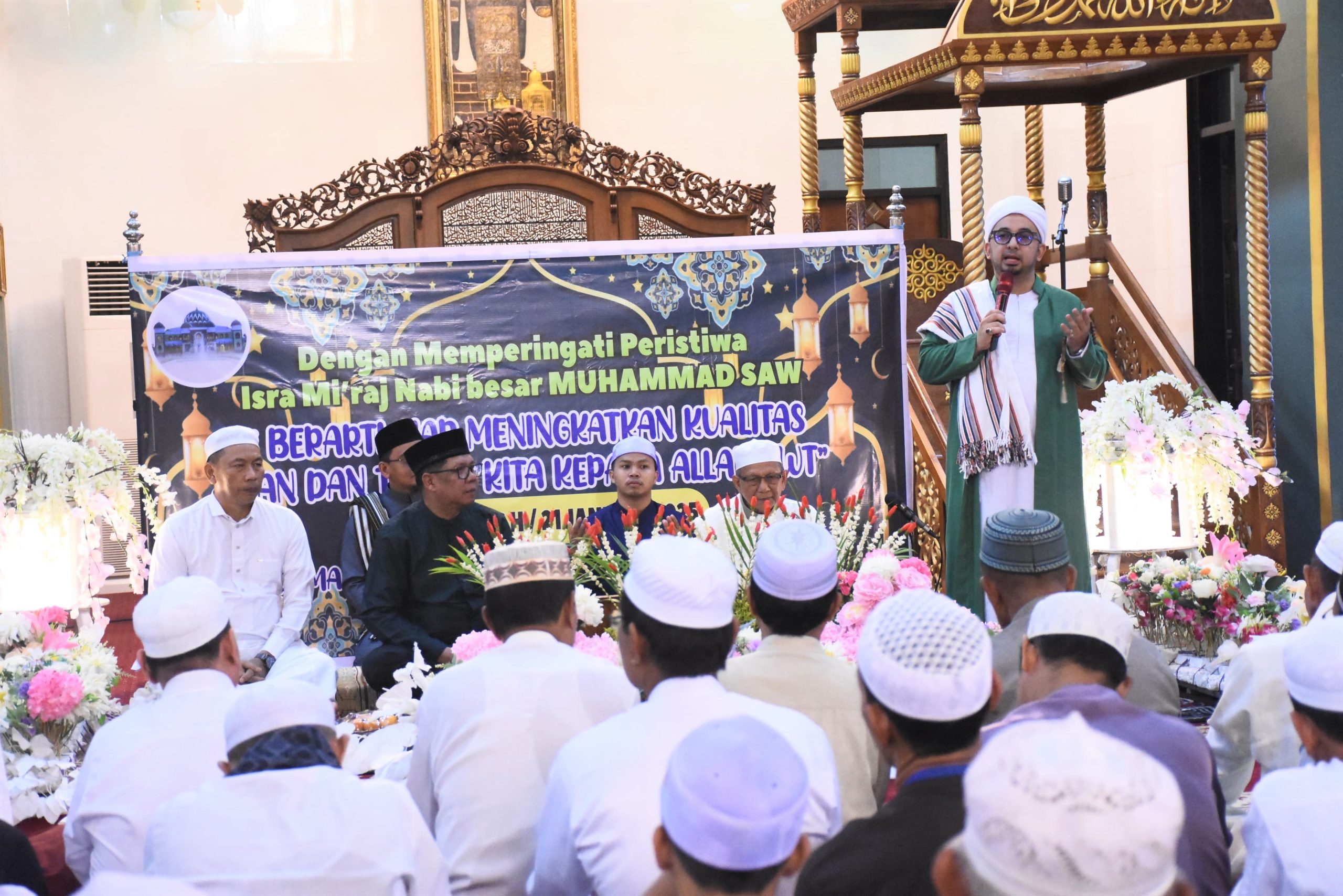 KUALA KAPUAS – Pj Bupati Kapuas Darliansjah menghadiri peringatan Isra Miraj Nabi Muhammad SAW yang diselenggarakan Badan Pengelola Masjid Agung Al Mukarram Kuala Kapuas, Selasa (21/1/2025) malam. Peringatan itu menghadirkan tausiah dari Al Ustadz Al Habib Achmad Bin Hasan Alaydrus Lc.