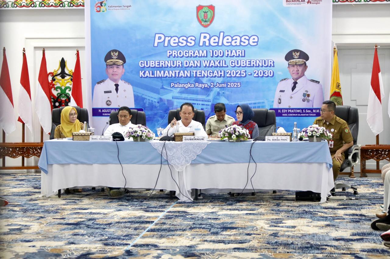 PALANGKA RAYA – Gubernur Kalteng Agustiar Sabran dan Wakil Gubernur Edy Pratowo memaparkan capaian program 100 hari kerja dalam sebuah konferensi pers, Senin (2/6/2025). Dalam kesempatan tersebut, gubernur menyampaikan berbagai kemajuan yang telah dicapai, diantaranya pada bidang infrastruktur, pendidikan, kesehatan dan pelayanan publik.